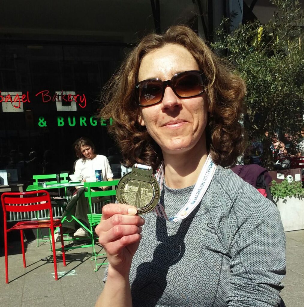 Dan kom ik op het 40km punt, ik ben er bijna. Natuurlijk heb ik het zwaar, maar ik heb nergens pijn of andere ongemakken. Dan loop ik de Coolsingel op. Er is zoveel publiek dat ik maar gewoon voor me kijk. Ik heb niet de illusie dat ik familie of vrienden zal herkennen in deze enorme menigte. Voor het eerst zie ik de klok en die geeft iets onder de 4 uur aan. En dat terwijl ik minstens 10 minuten na het starten van de klok wegging. Dat betekent dus een keurige tijd. Eenmaal over de finish zie ik 3:46 uur op mijn horloge staan. Geen PR, maar wel de op één na beste tijd ooit. Wow, ik ben dik tevreden!